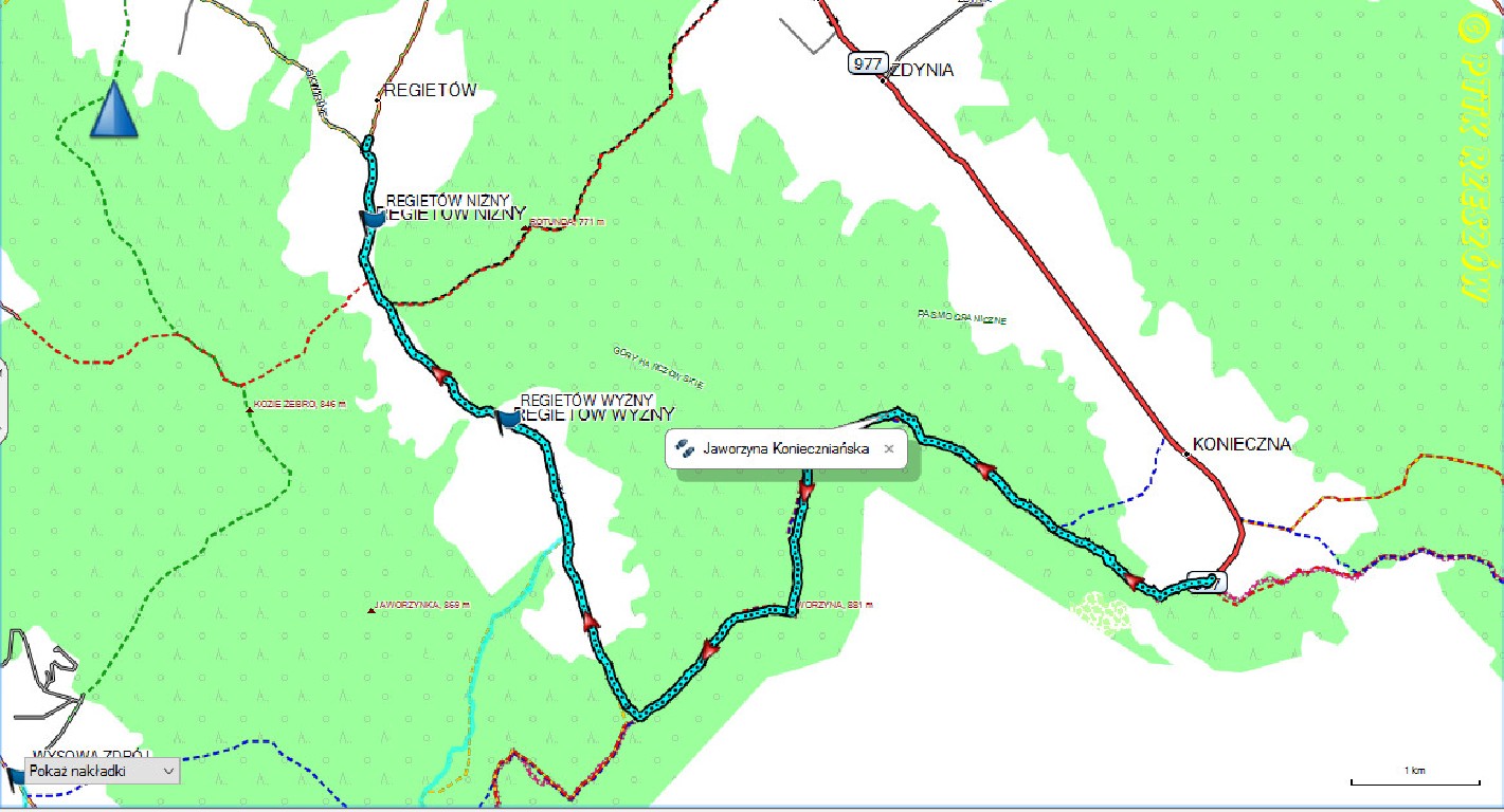 * Przejście piesze: Przeł. Beskidek – cmentarz z I wojny nr 46 – Jaworzyna Konieczniańska (881) – Przeł. Regetowska – Regietów Wyżny – Regietów Niżny.